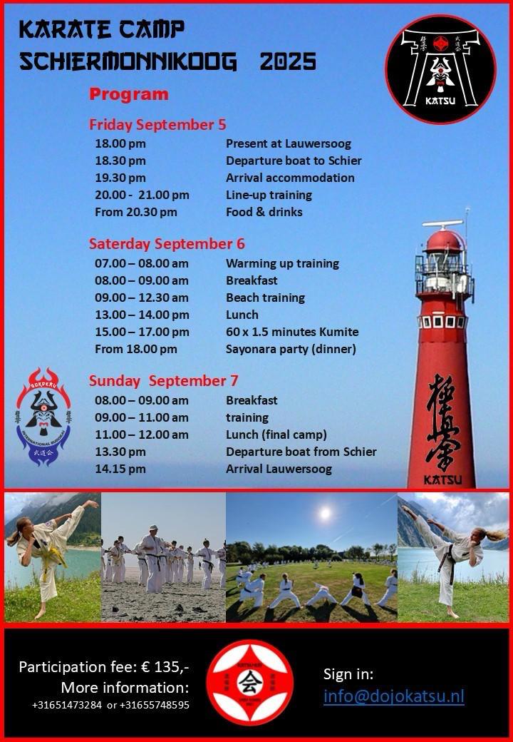 Voor uitdagende trainingen, kyokushin-mentaliteit en sfeer kunt u jaarlijks deelnemen aan ons Katsu-karatekamp op Schiermonnikoog. Dojo Katsu organiseert dit al meer dan 35 jaar onder vlag van de International BudoKai. Het begon met een groep karateka’s die met de kano van Winsum naar Pieterburen vertrok, om vervolgens over het wad naar Schiermonnikoog te lopen. Dit was een tocht van 4 uur. Ze sliepen in legertenten en er werd onder alle weersomstandigheden getraind.